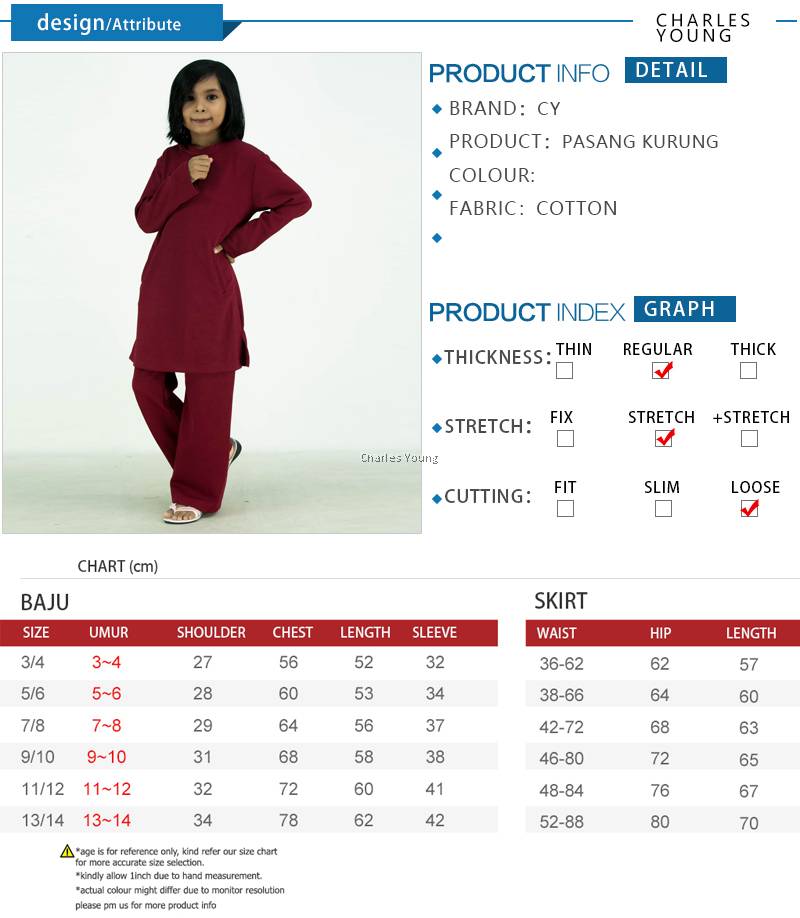 | Highlights | • Design Exclusive / Corak Menarik and Stylish • Material Tak Mudah kedut / Segak Sepanjang hari • Kain Sejuk / Sesuai Untuk Pakai Di Outdoor Atau Indoor • Kain Tak Melekat Badan / Sesuai untuk pemakaian masa panjang • Kain memeri / Jenis Kain Tahan Lama |