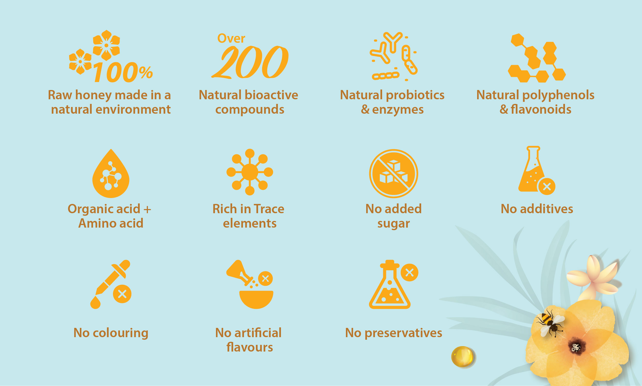 | Highlights | 100% Pure Honey 200 Natural Bioactive Compounds Natural Probiotics and Enzymes High Antioxidants Rich in Trace Elements Natural Polyphenols and Flavonoids No added Sugar |