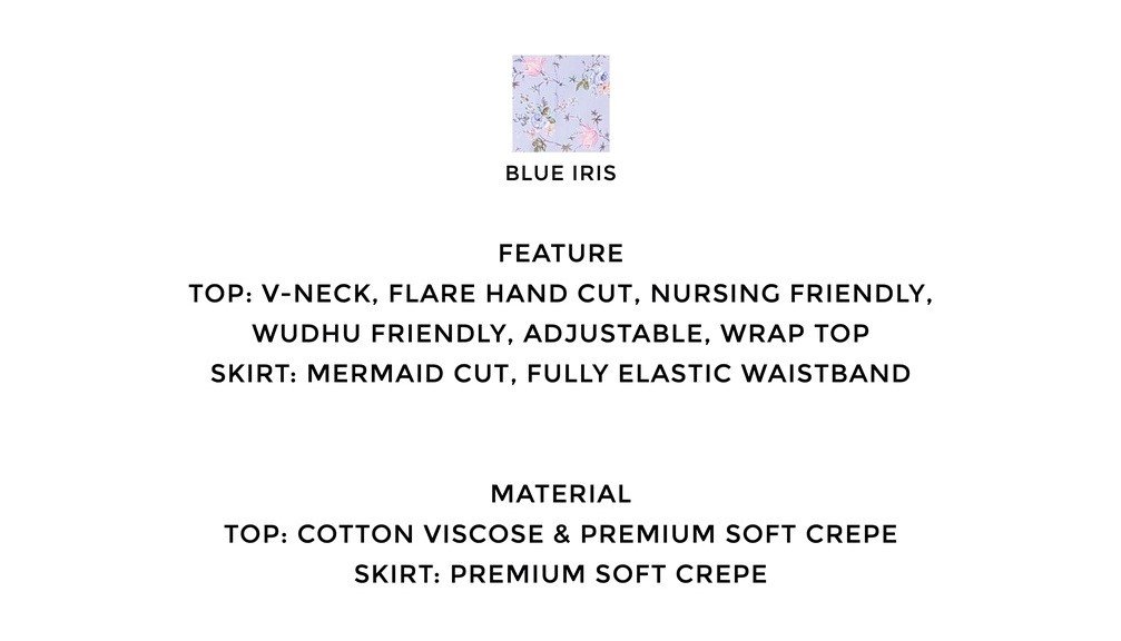 | Highlights | • V-neck • Flare hand cut • Nursing friendly • Wudhu friendly • Adjustable • Wrap top skirt • Mermaid cut • Fully elastic waistband |