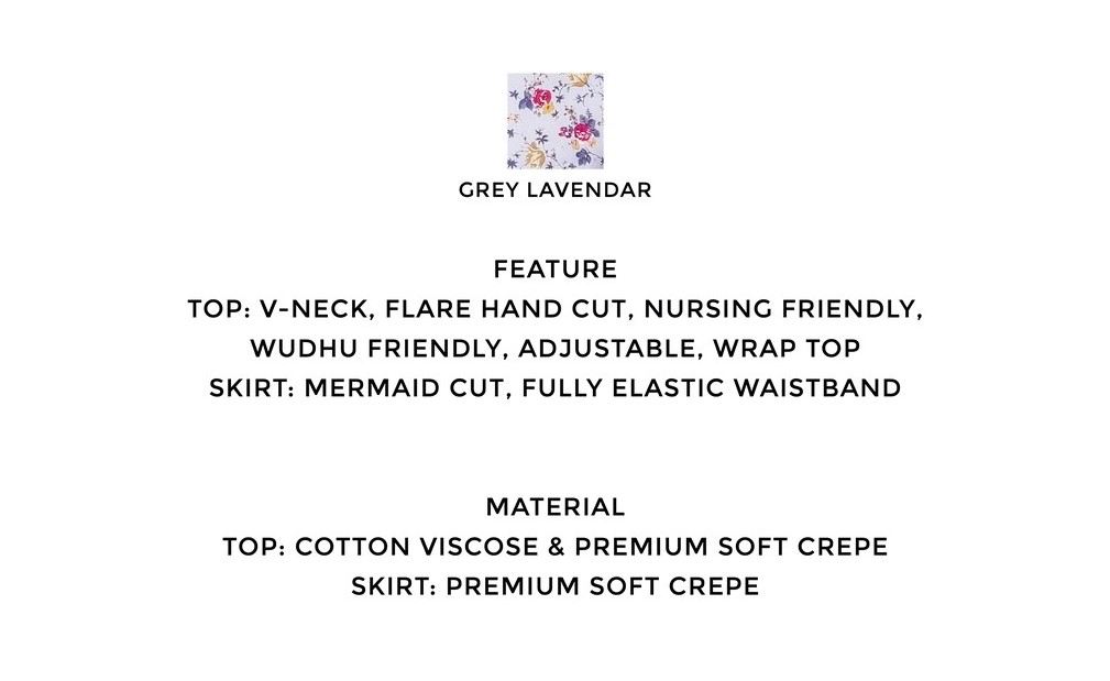 | Highlights | • V-neck • Flare hand cut • Nursing friendly • Wudhu friendly • Adjustable • Wrap top skirt • Mermaid cut • Fully elastic waistband |