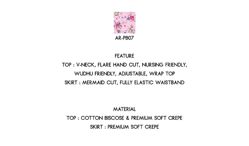 | Highlights | • V-neck • Flare hand cut • Nursing friendly • Wudhu friendly • Adjustable • Wrap top skirt • Mermaid cut • Fully elastic waistband |