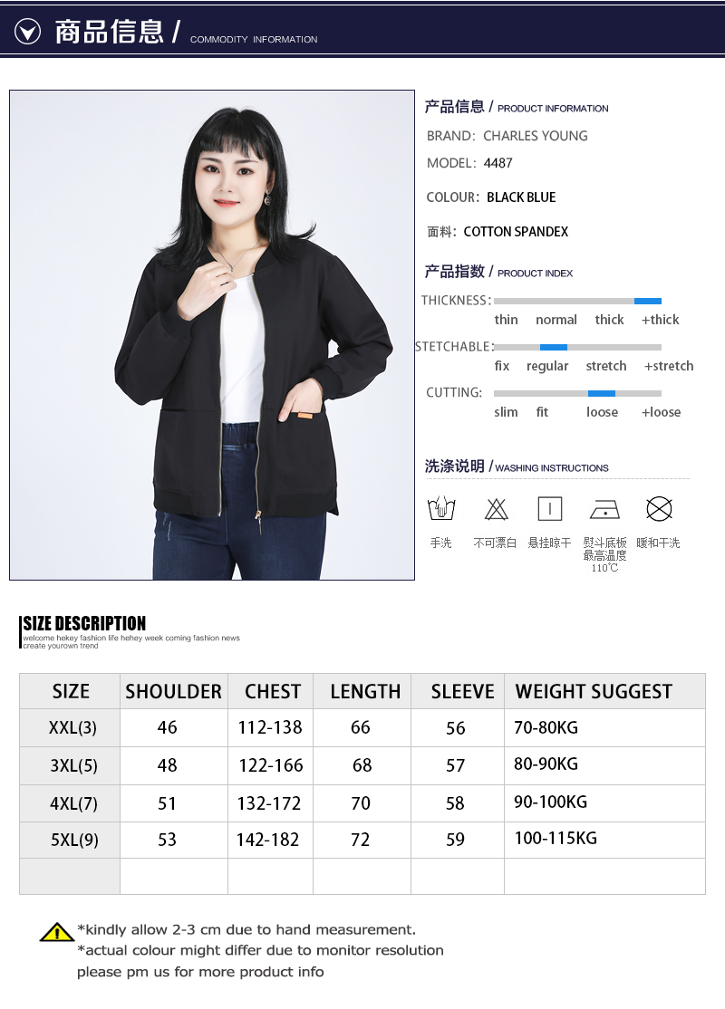 | Pattern/Finishing | Neckline Cutting/Uplift Shoulder Design/Long Sleeve/Front Zip |