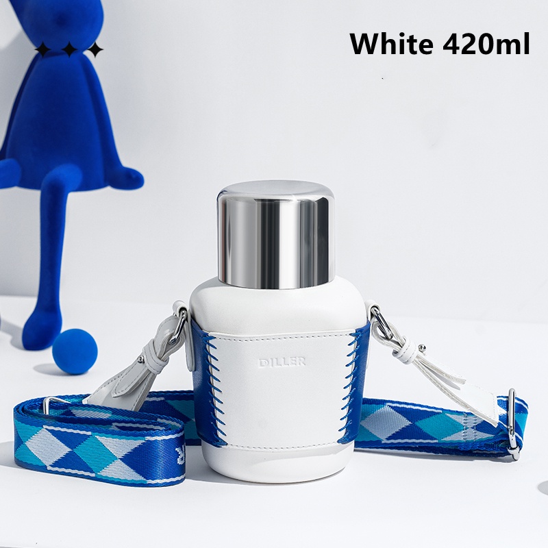 Diller High Quality Cubic Thermo Flask Straw/Direct Bottle with Woven Strap Leather Bag 420ml (White)