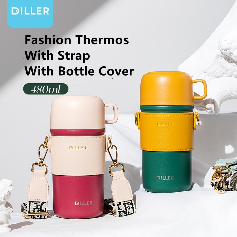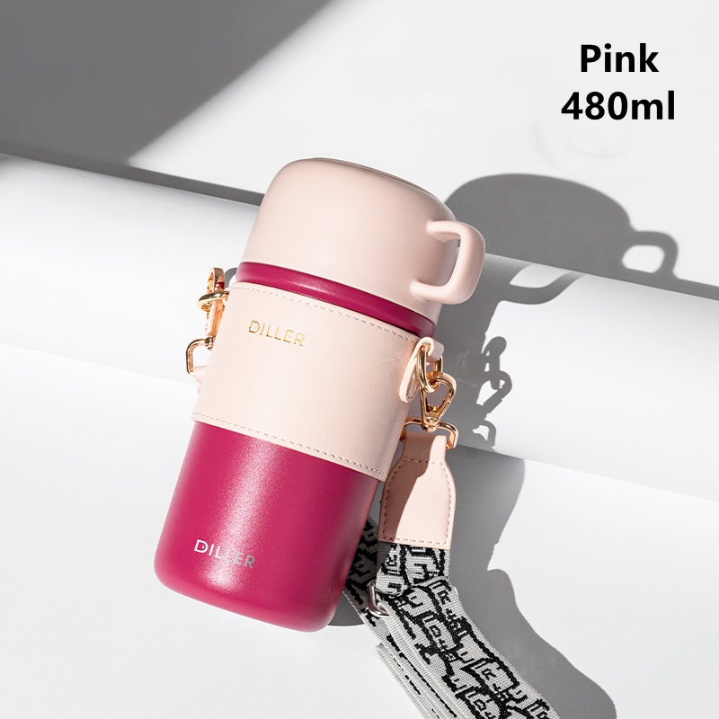 Diller Luxury Straw/Direct Thermo Water Bottle with Woven Sling 480ml (Pink)