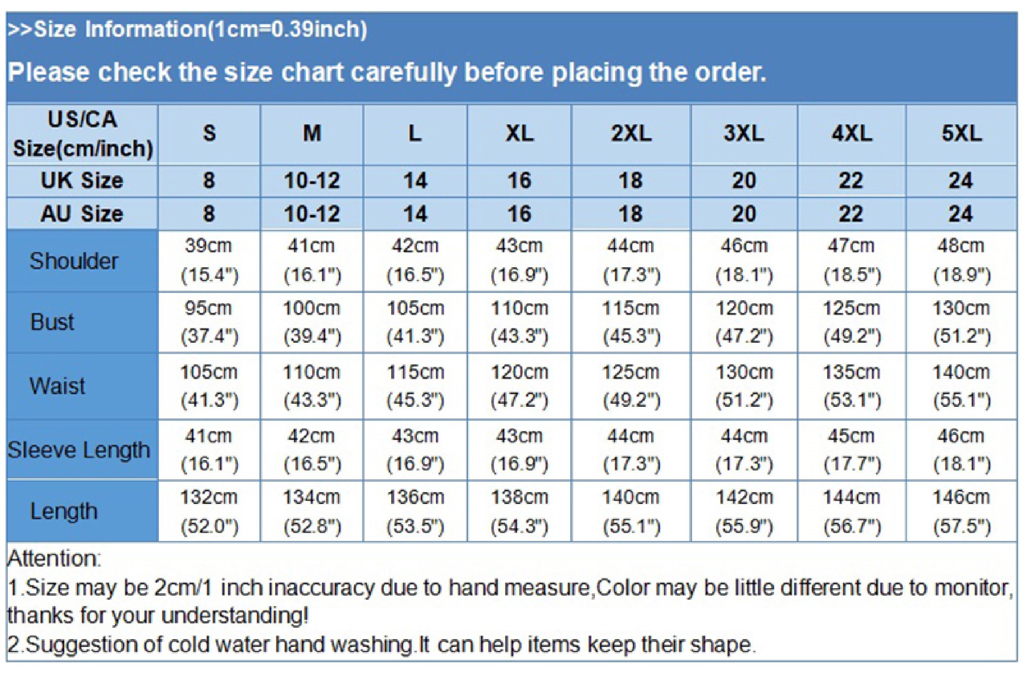 | Size / Product Measurement (L x W x H) | Please refer to the size chart |