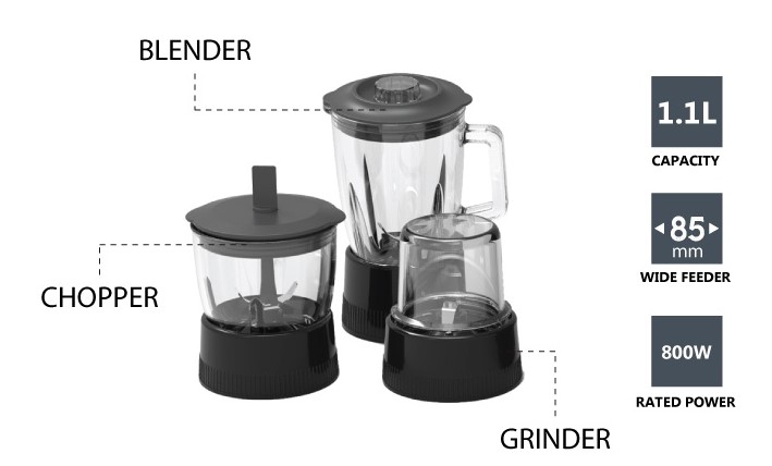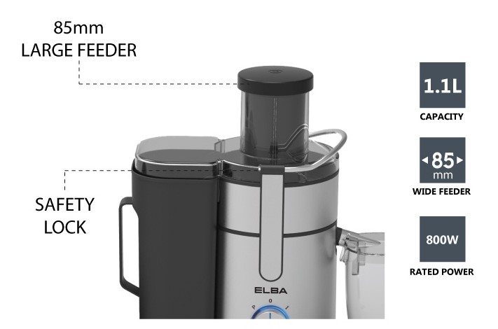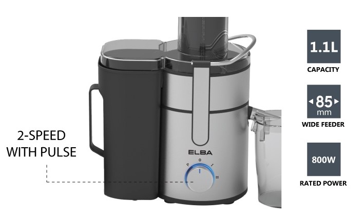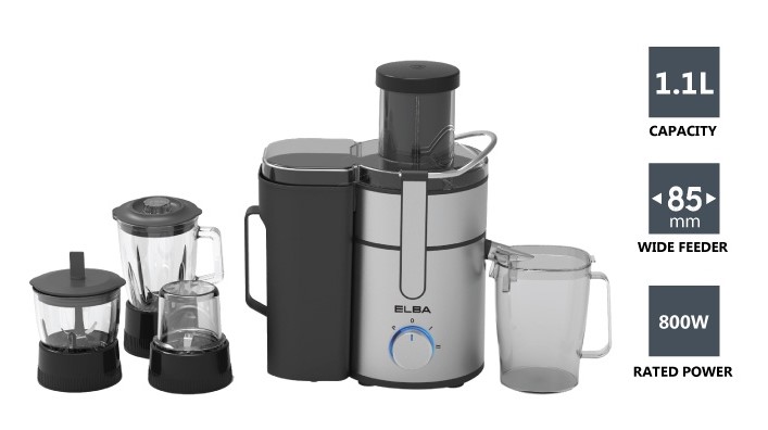| Highlights | • Power: 800W • Juice Cup Capacity: 1,100ml • Pulp Cup Capacity: 2,500ml • 2-speed control with pulse function • 85mm extra wide feeder for a whole apple • Stainless steel body • With stainless steel grater and filter • Lift Up The Spout with Drip Stop Feature • With safety micro switch • Anti-slip rubber feet • With safety handle lock • With indicator light when power is on • Accessories: Glass Blender, Glass Grinder and Glass Chopper |