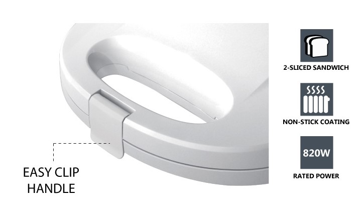 | Highlights | • Power : 680-820W • 2 Slice sandwich baking plate • Non-stick coating cooking plate • Easy clip handle • Overheat safety protection • With indicator light |