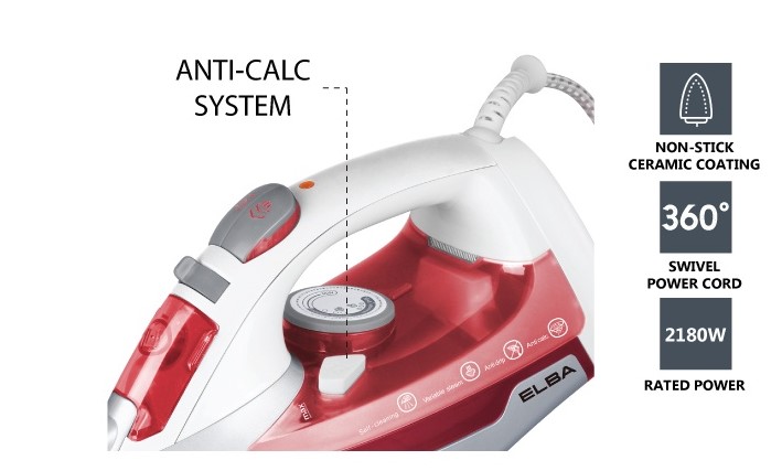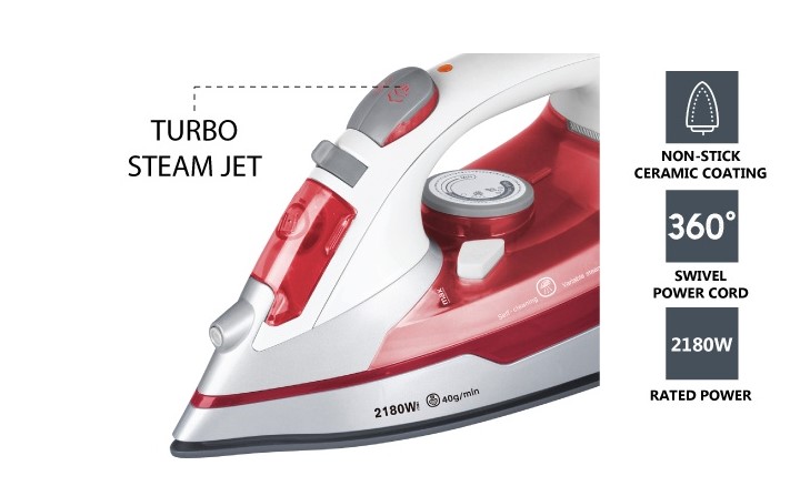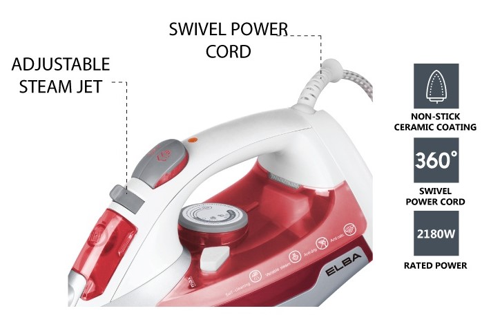 | Highlights | • Power: 1,830W - 2,180W • Function: Dry / Spray/ Steam • Variable Steam Control and Powerful Burst of Steam • Anti- Calc System • Ceramic Coating Soleplate • Anti-slip Handle • Easy Water Refill Hole • 360° Swivel Power Cord • Adjustable Temperature Control Dial • With indicator light • Flexi Cable For Easy Ironing • With Overheat Safety Protection |