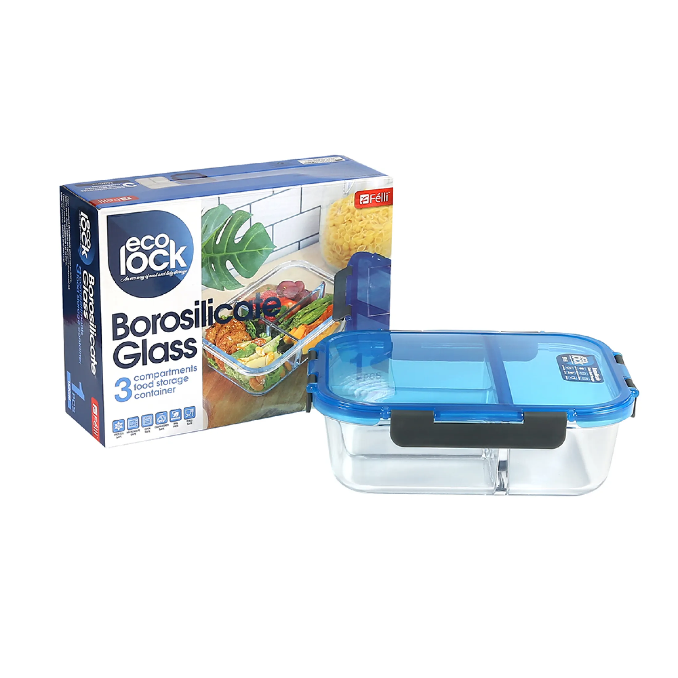 | What's In The Box | 1 unit x Felli Ecolock 1520ml Borosilicate Glass Food Storage Container – 3 Compartments |