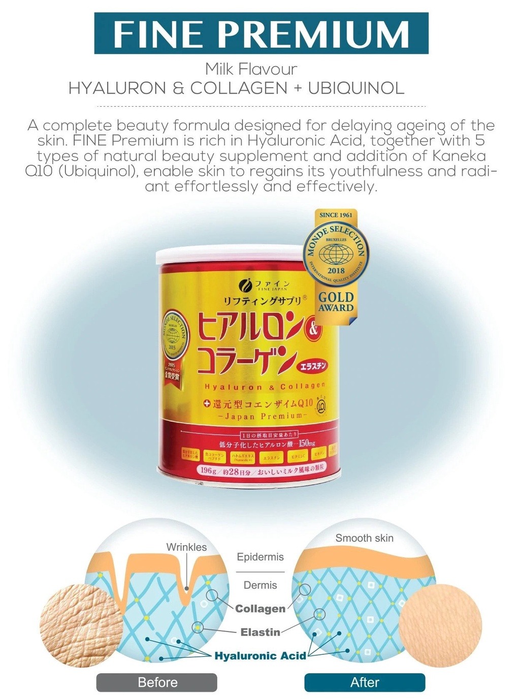 | Highlights | • A lifting supplement: Lifting regains youthful vitality in your skin by renewing its elasticity and firmness. As FINE's newest conceptualization, our lifting supplement aims to incorporate skin and body beauty into your daily lifestyle effortlessly and effectively. The powder form is easy to melt and instantly ready to go-dissolve it in your favorite beverage of choice. It build your beauty from within. • Tin Pack - 196g/28 days supply |