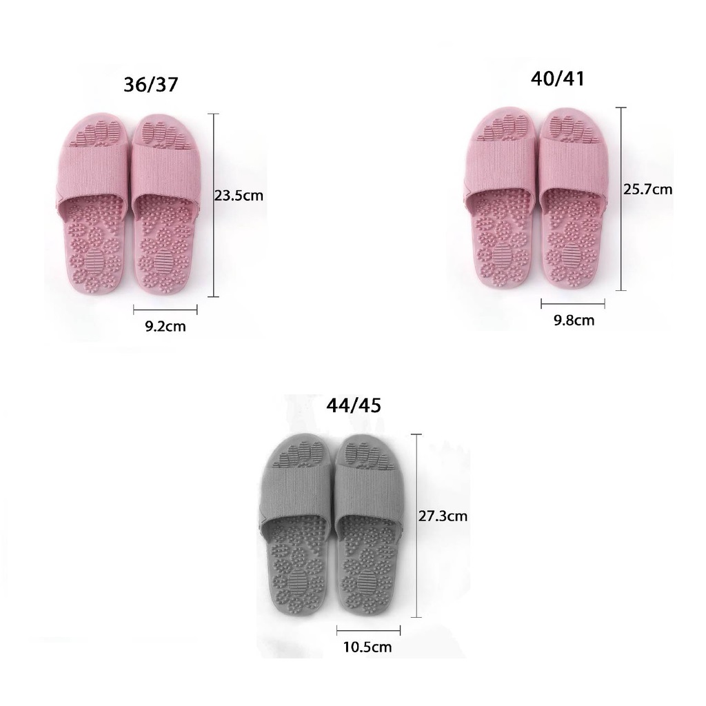 | Highlights | Slippers style: Loop toe slippers; Grey : Size: 44 =44/45 around 10.5cm*27.3cm Purple : Size: 40 =40/41 around 9.8cm*25.7cm Pink : Size: 36 =36/37 around 9.2cm*23.5cm Please refer the size measurement .to prevent purchase wrong size Sole material: PVC Applicable gender: neutral Whether covered heel: no Function: breathable wear-resistant massage non-slip Popular elements: massage point Thickness: thick Upper material: PVC Color: pink, purple, grey |