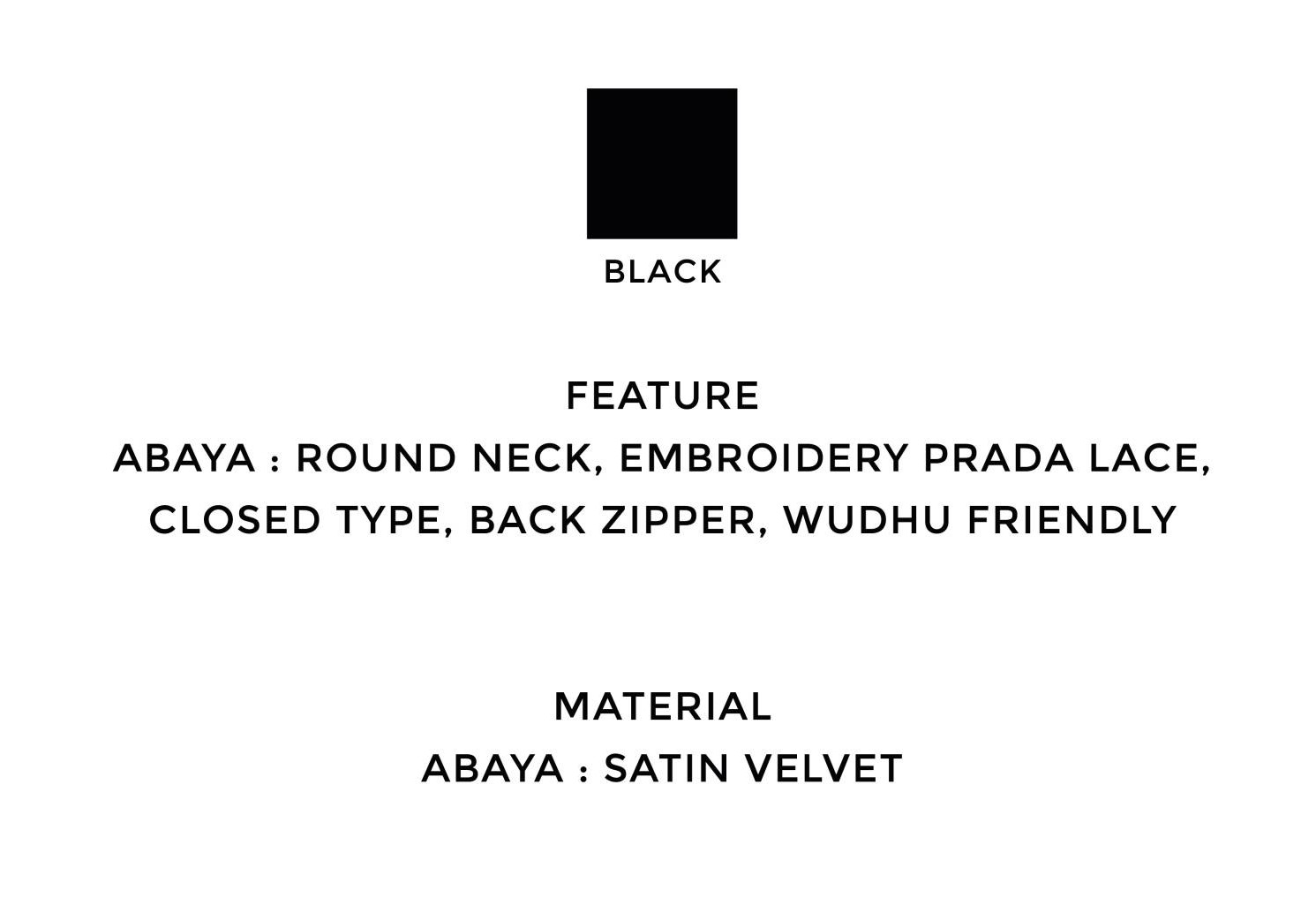 | Highlights | Abaya Zairaa menggunakan material satin velvet yang dan dihiasi dengan prada lace eksklusif. pada si pemakai. Dengan dua (2) pilihan warna yang dijahit kemas menampakkan glam si pemakai. Sesuai bagi mereka yang mementingkan kelas dan keselesaan. Ready Stock |