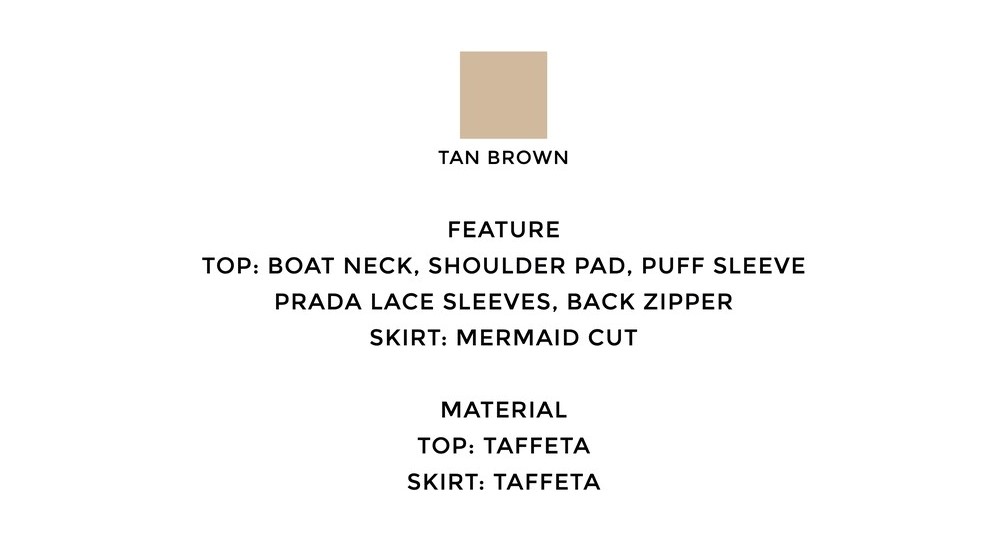 | Highlights | • Boat neck • Shoulder pad • Puff Sleeve • Prada lace sleeves • Back zipper • Mermaid cut skirt |