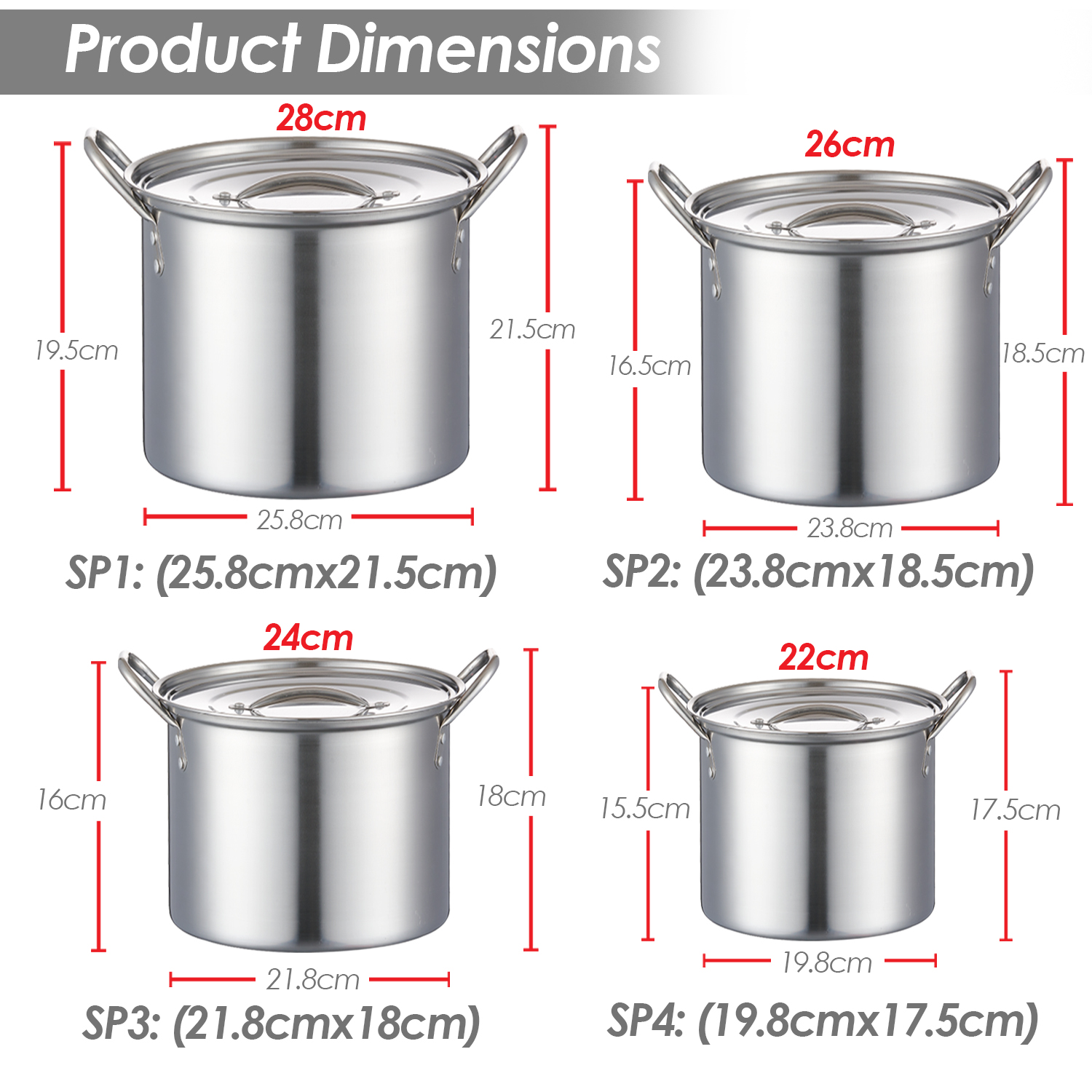 | Highlights | - Set come with 4 stock pot size 22cm, 24cm, 26cm & 28cm - Anti-scalding handle - Solid design easy handle & clean - High thermal conductivity bottom surface - Suitable for all cookware included induction cooker - Stackable design, easy to store after use |
