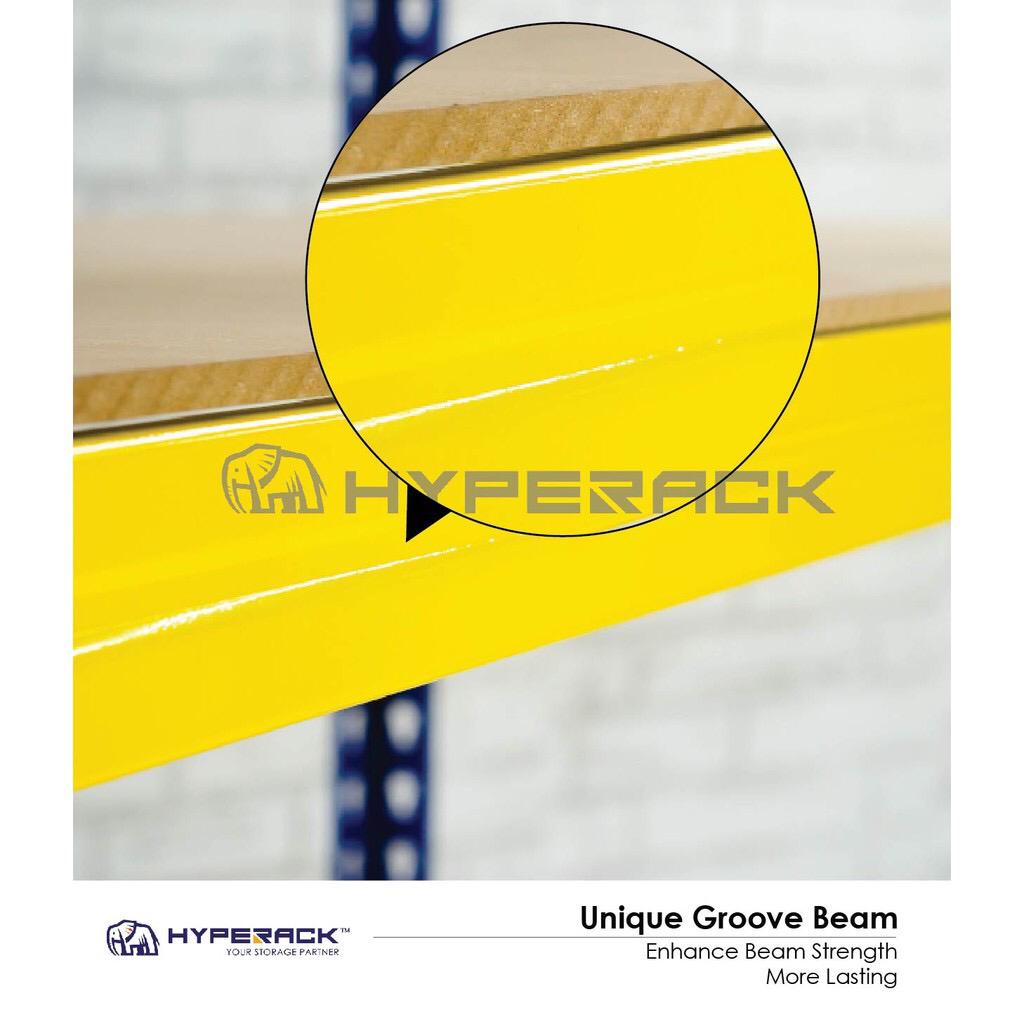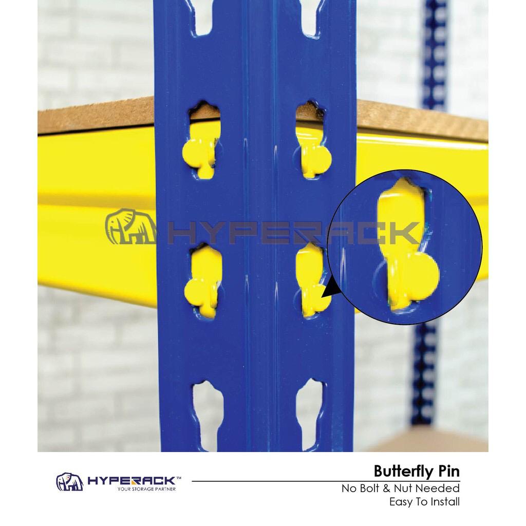 | Highlights | - Colour: Blue & Yellow - Level: 4 Levels - Length 150cm = 300kgs U.D.L. per level - Center Support: Only apply for size 1200/1500 (1 pc), 1800 (2pcs) & Enhance middle part loading - Butterfly Pin: No Bolt & Nut needed, Easy to install - Unique Groove Beam: Enhance beam strength, more lasting |