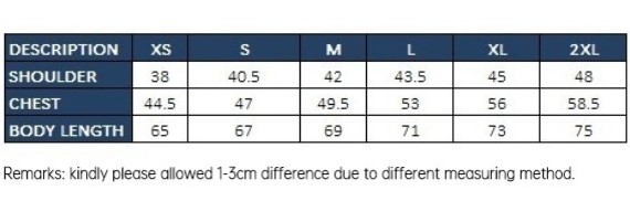 | Size / Product Measurement (L x W x H) | Please refer to the size chart |