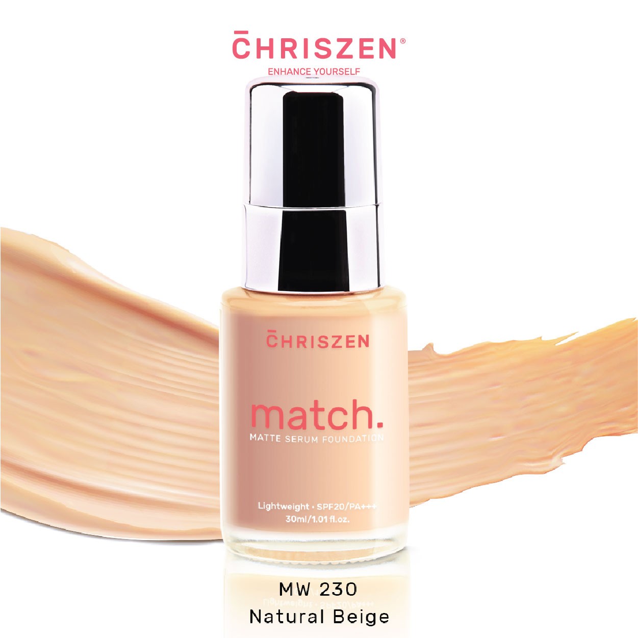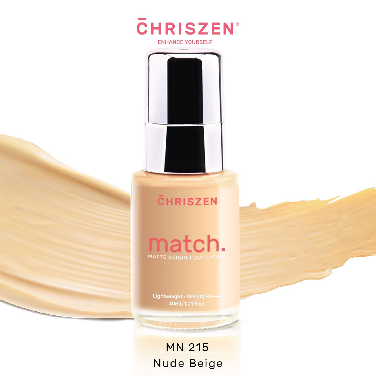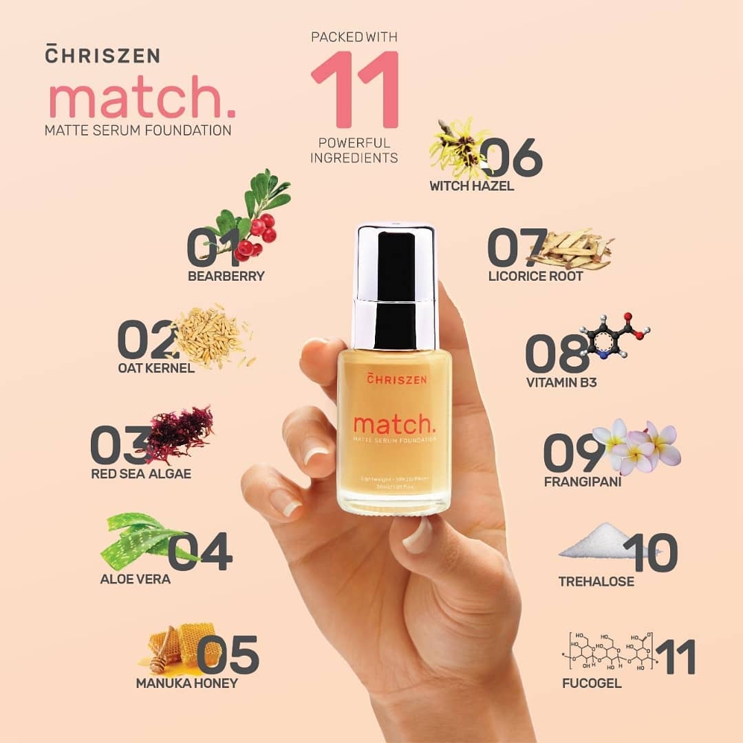 The Chriszen Match Matte Serum Foundation is a natural looking matte finish foundation with 11 active ingredients such as Bearberry Extract, Oat Kernel Extract, Red Sea Algae and etc, and mostly it contains the active agent which naturally lightens and brightens skin which leading to healthier and younger-looking skin.