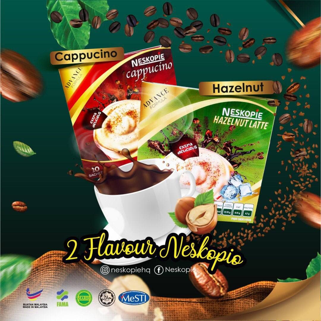 NESKOPIE adalah minuman pracampuran yang telah dikisar dengan biji kopi premium arabica dan robusta. Dirumus khas menggunakan gula kelapa yang rendah indeks glycemic yang membantu serta menurunkan kadar gula dalam darah. Terdapat dalam dua jenis perisa iaitu NESKOPIE CAPPUCINO DAN NESKOPIE HAZELNUT.