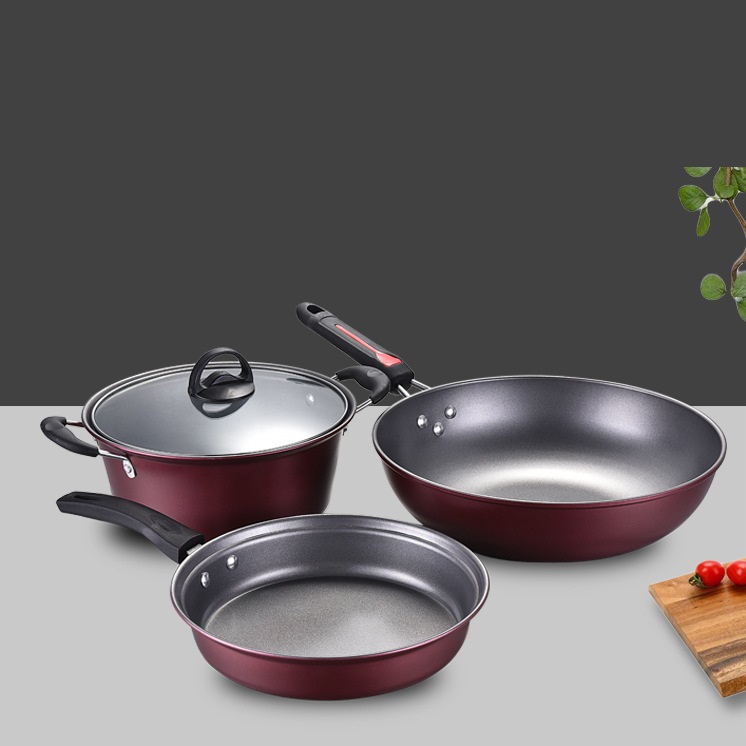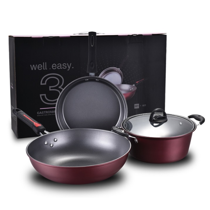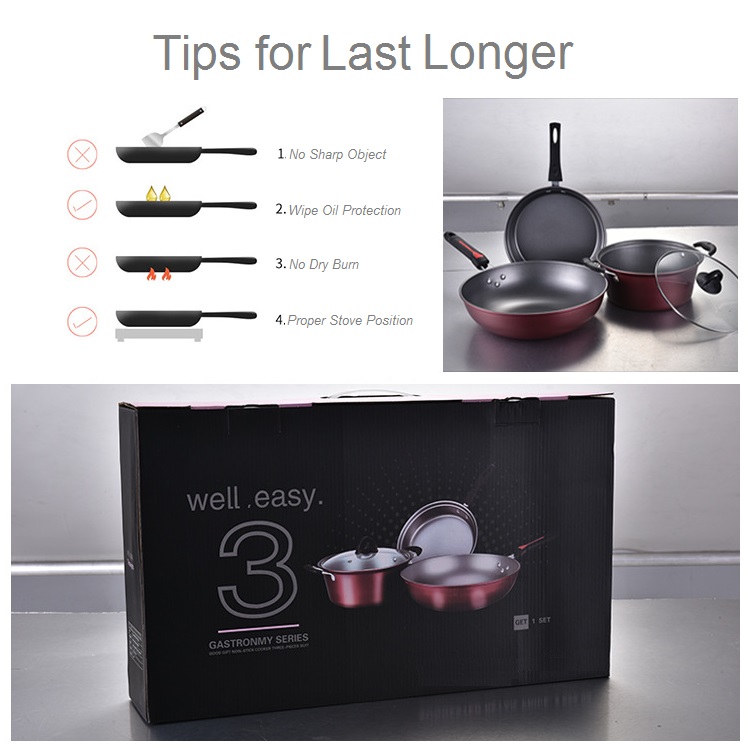 | Highlights | - Cookware Set 3 in 1 - Cooking Pan + Cooking Pot + Wok Pan - Ergonomic Handle - Non-Stick Pot and Pan - Durable, Easy To Clean, Non hot Handle - Suitable For Gas Stove |