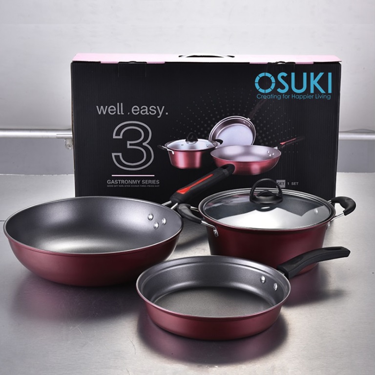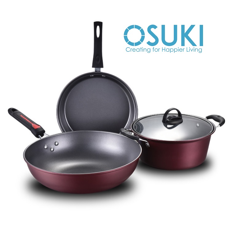 OSUKI Cookware Set (3 in 1) is a which included Cooking Pot with lid, Cooking Pan, and Wok Pan in a set. Non stick cooking set, easy to clean and design with a ergonomic non hot handle. Suitable for gas stove.