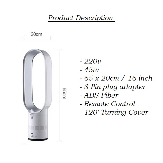 | Highlights | - Infinite speed regulation - Rated frequency 50-60HZ - Rated power 45W - 3 pin plug adaptor - Remote control - Size 65 x 20cm / 16 inch - Rated voltage 220V - Noise 40-50db - 120' rotating - ABS fiber material |
