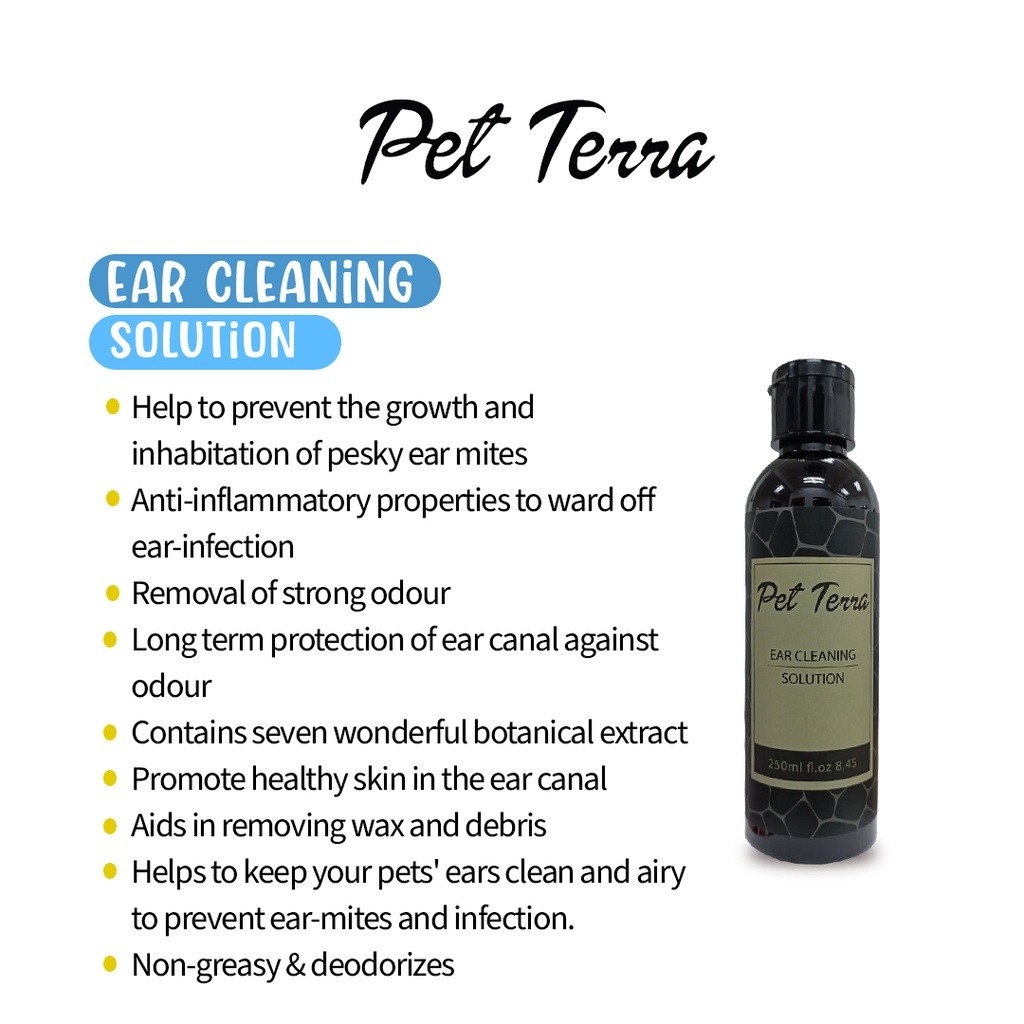 | Highlights | • Help to prevent the growth and inhabitation of pesky ear mites. • Anti-inflammatory properties to ward off ear-infection. • Removal of strong odour. • Long term protection of ear canal against odour. • Contains seven wonderful botanical extract. • Promote healthy skin in the ear canal. • Aids in removing wax and debris. • Helps to keep your pet's ears clean and airy to prevent ear-mites and infection. • Non-greasy and deodorizes. |
