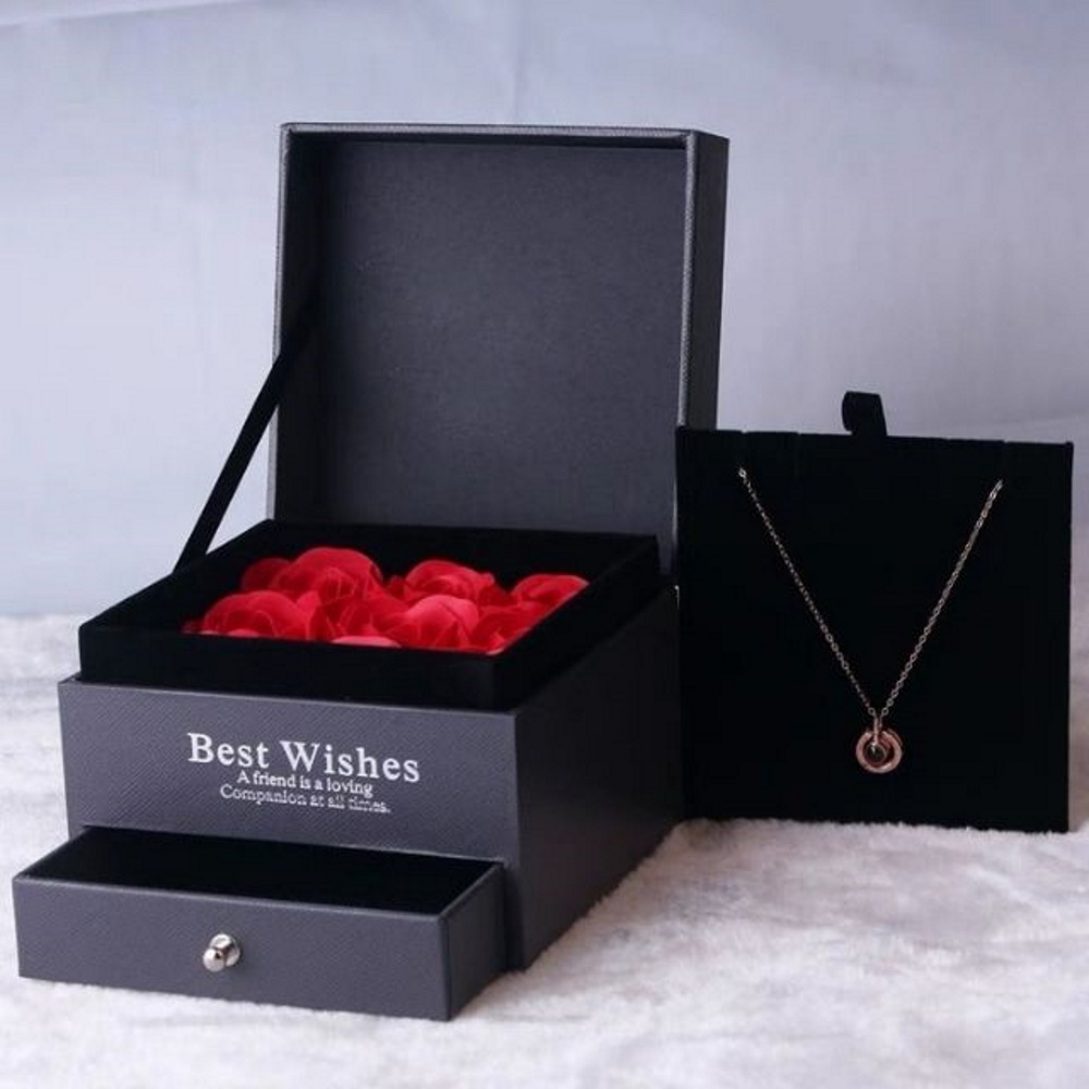| Highlights | - Smooth and soft surface, no burrs, feel comfortable. - Small and exquisite packaging, beautiful bowknot decoration, elegant and beautiful. - The soap flower drawer design gives a romantic and warm surprise. - Small items such as ring necklaces can be placed, suitable for Valentine's Day, wedding anniversary and other gift packaging. - Gifts like lipstick and necklace are not included, for shooting purpose only. |