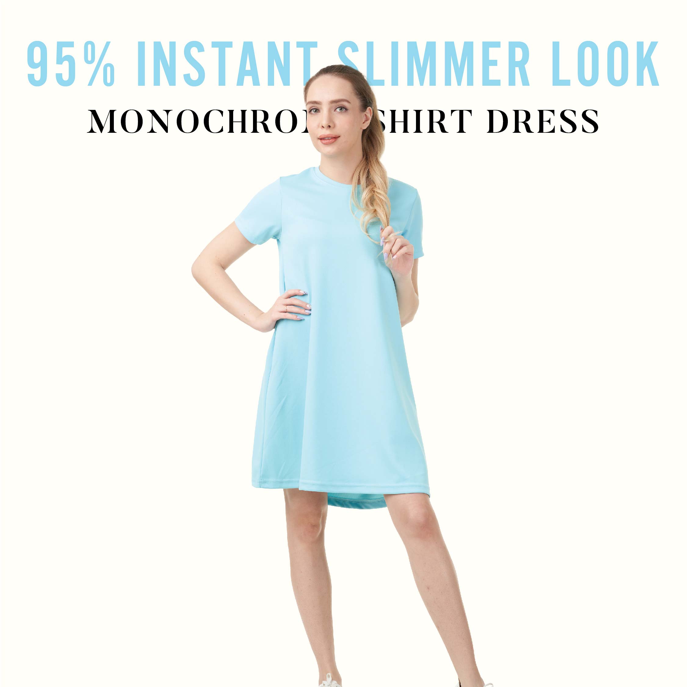 Vomos Instant Slimmer Look Monochrome Round Neck Casual Plain T Shirt Dress (Blue)